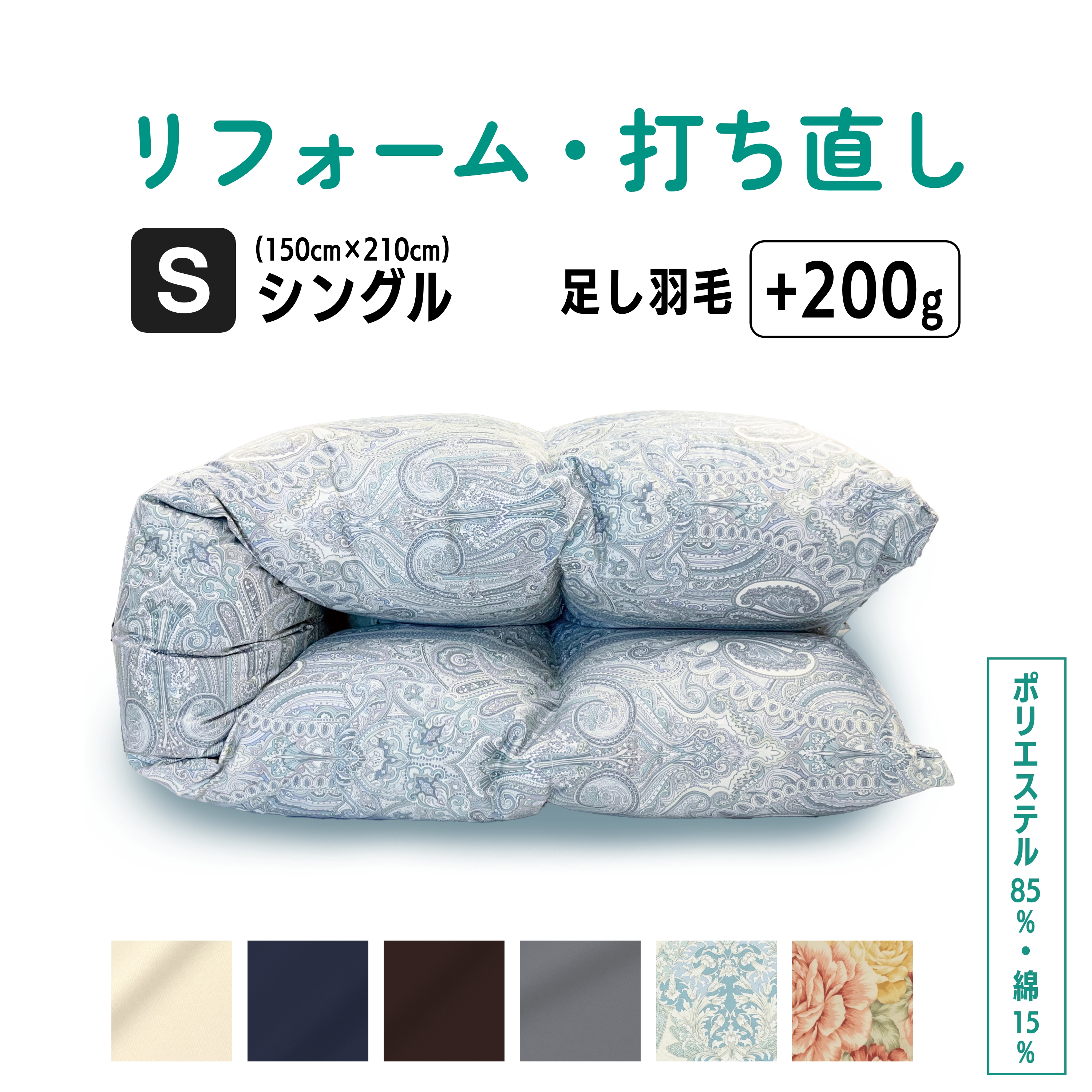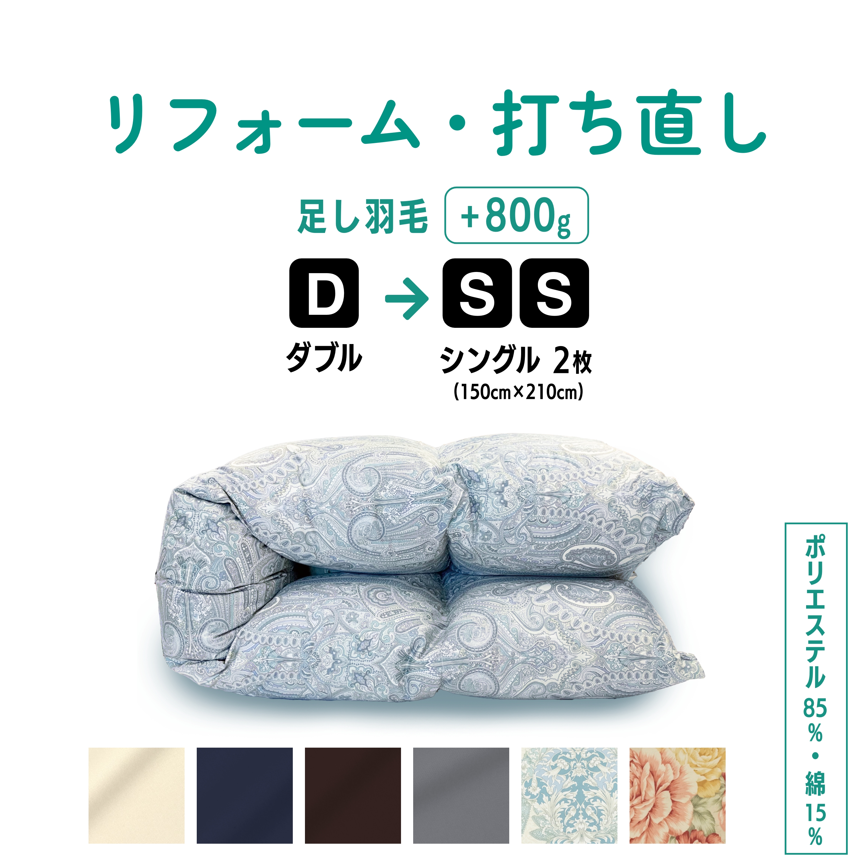 ※側地が裂けて消失してしまった分の羽毛の補充については、リフォーム料金には含まれておりません。消失分の羽毛の補充をご希望の場合は、事前にお問い合わせください。
